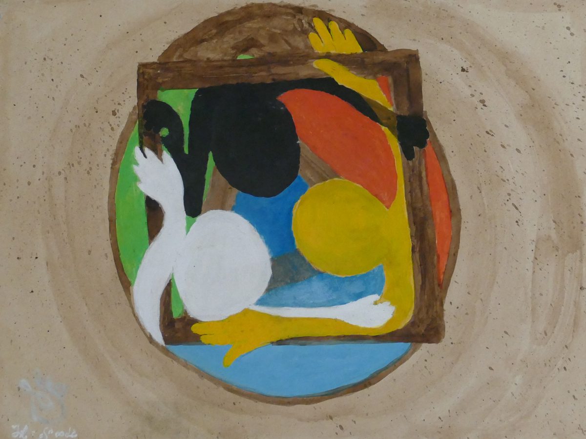 Ce tableau abstrait présente une composition centrée sur les couleurs primaires et les formes géometriques de base: cercles, carrés et triangles.La transgression de l’artiste lui permet de passer aux 3 couleurs de l’humanité: noir, jaune et blanc.