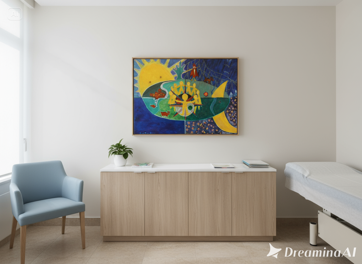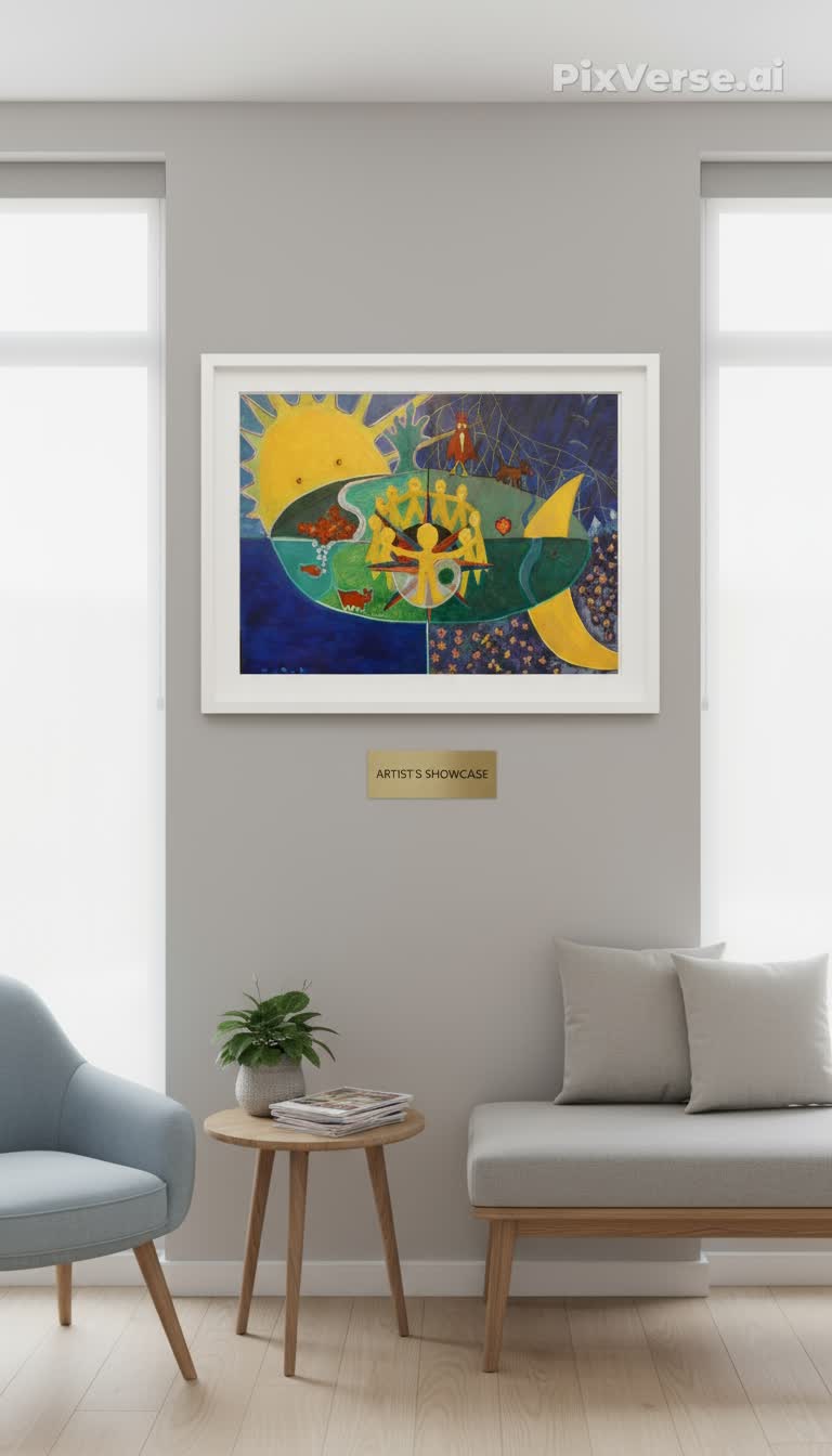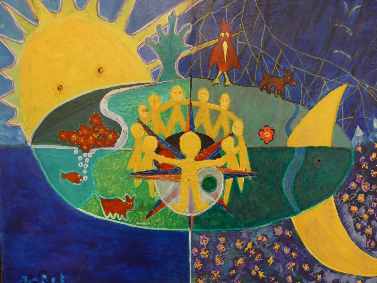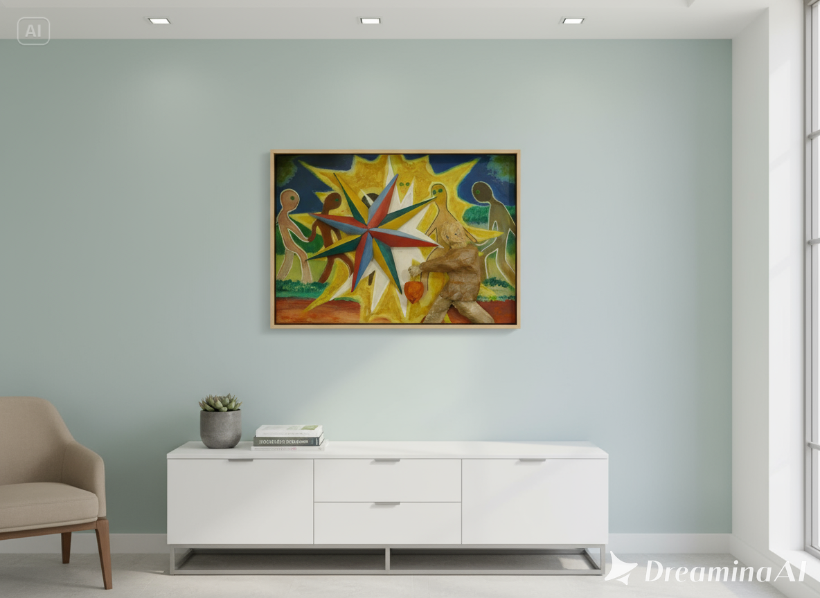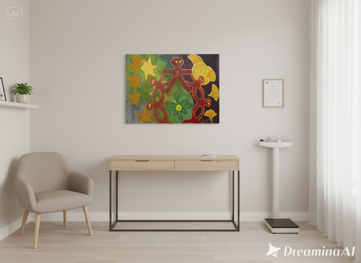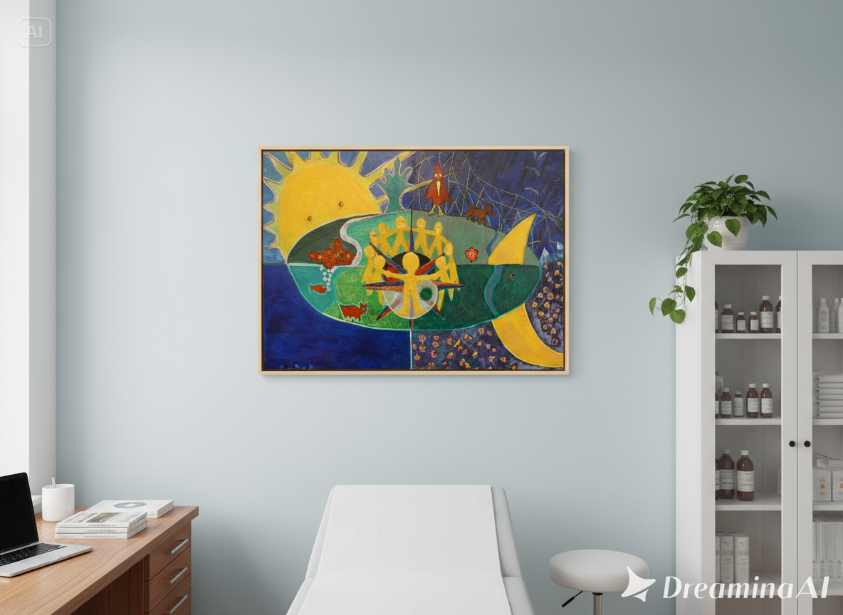 Les silhouettes humaines unies en cercle évoquent la force de la conscience. Un tableau coloré et poétique célébrant l’universalité.