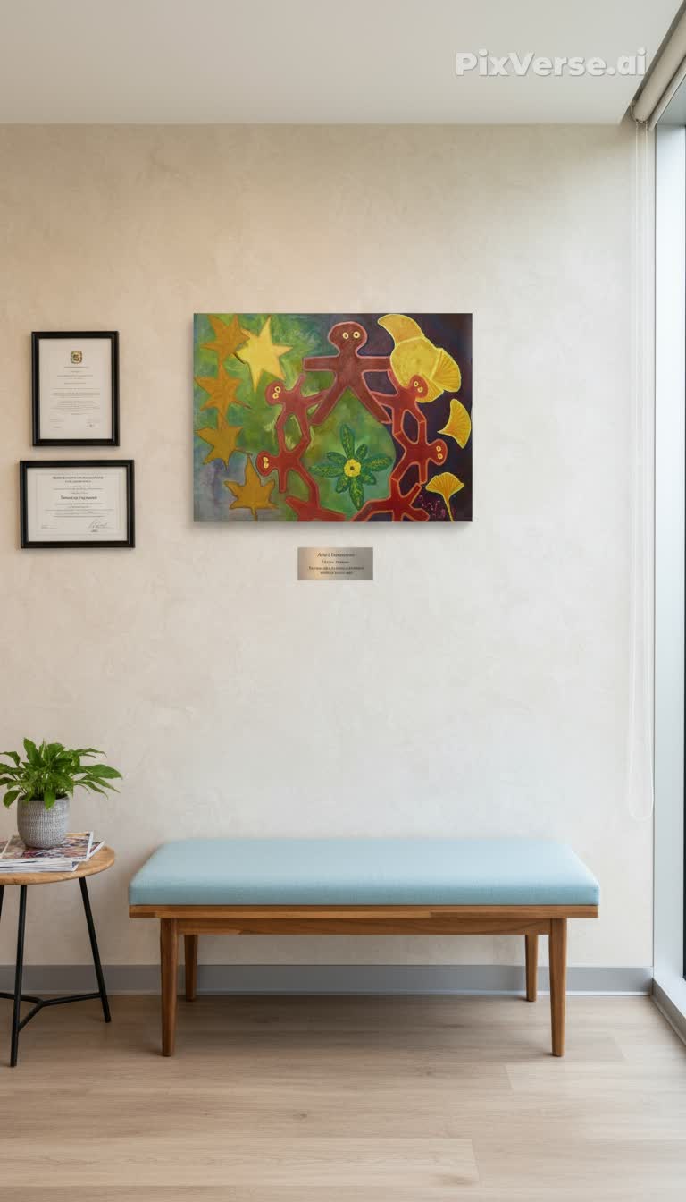 Les couleurs chaudes et profondes de l’arrière-plan contrastent avec les tons bleus,verts,rouges et jaunes du premier plan, suggérant la tension entre la matière et la lumière, la terre et le ciel. L’ensemble dégage une impression de mouvement intérieur, comme une pulsation vitale au cœur de l’univers.
