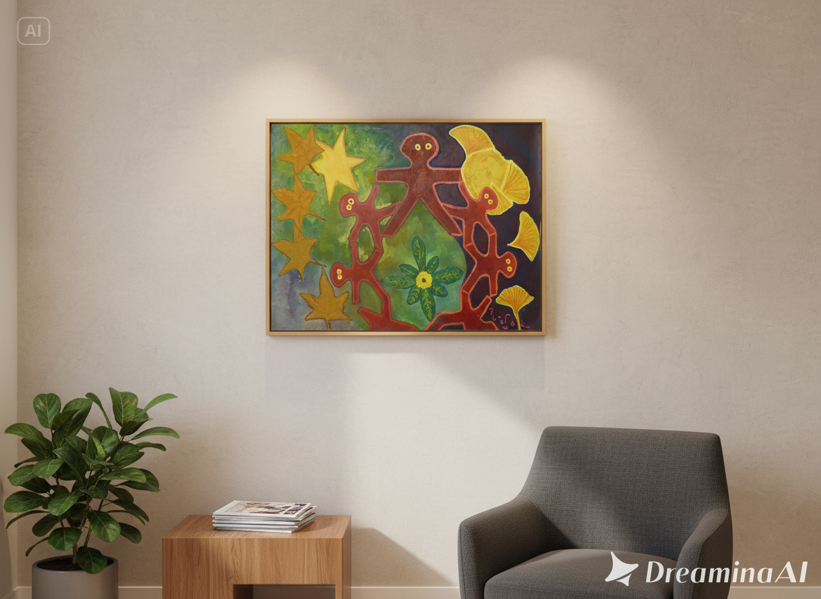 « Jojoba et Erable » explore la symbiose entre l’humain et la nature à travers une danse de formes et de couleurs. Les silhouettes rouges, unies dans un mouvement circulaire, incarnent la force des liens du vivant. Au centre la fleur dorée et les feuilles vertes évoquent la renaissance universelle. Une œuvre rayonnante où se mêlent symbolisme, chaleur et harmonie.